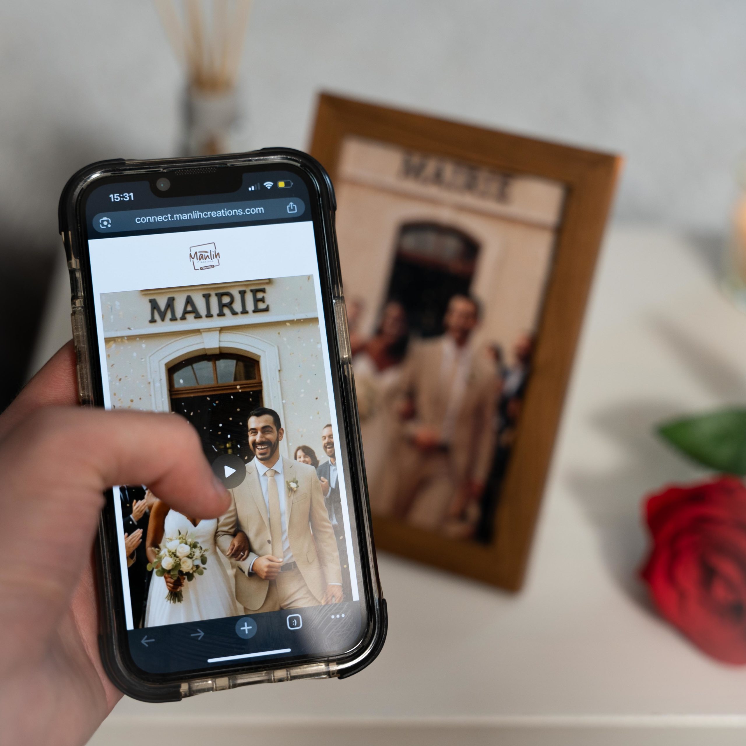 Ce cadre connecté intègre une puce NFC qui permet d’accéder à un contenu personnalisé : galerie photo, vidéo, message ou lien de votre choix. Il suffit d’approcher un smartphone compatible pour ouvrir le lien automatiquement, sans application.